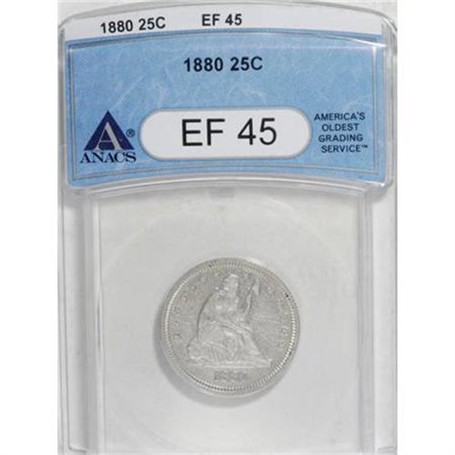<B>1880 25C XF45 ANACS.</B></I> NGC Census: (1/104). PCGS Population (2/169). Mintage: 13,600. Numismedia Wsl. Price for NGC/PCGS coin in XF45: $341. (#5512)<BR><BR><B>Coin Engraver:</B> Christian Gobrecht<BR><BR><b>Shipping:</b> Coins & Currency (<a target="_blank" href="http://www.heritageauctions.com/common/shipping.php">view shipping information</a>\)