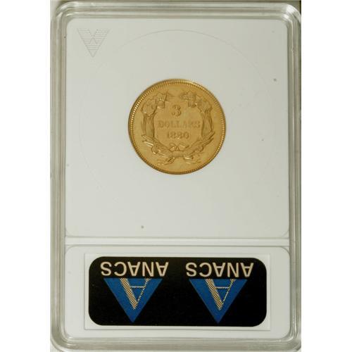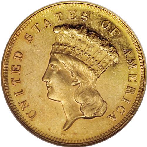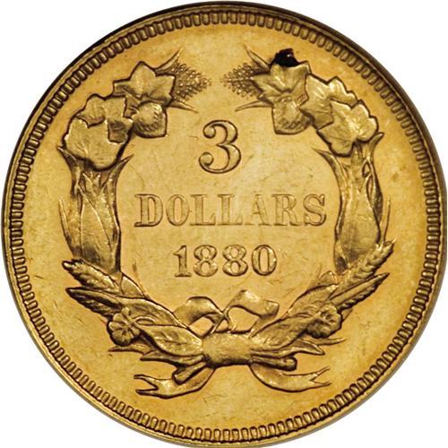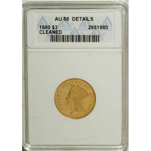 <B>1880 $3 --Cleaned--ANACS. AU58 Details.</B></I> Bright lemon luster illuminates protected areas of this lightly cleaned and moderately abraded representative. Although slightly glossy, many collectors would be proud to own this rare date gold coin. From a minuscule business strike production of 1,000 pieces. Karl Stecher, Sr. purchased this piece from the Guttag Bros. of New York during the 1930s. <BR><I>From The Stecher Collection, Part Two.</B></I><BR><BR><b>Shipping:</b> Coins & Currency (<a target="_blank" href="http://www.heritageauctions.com/common/shipping.php">view shipping information</a>)