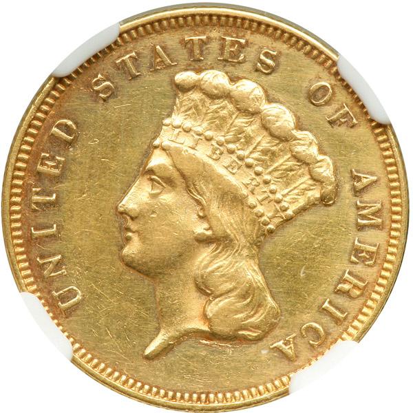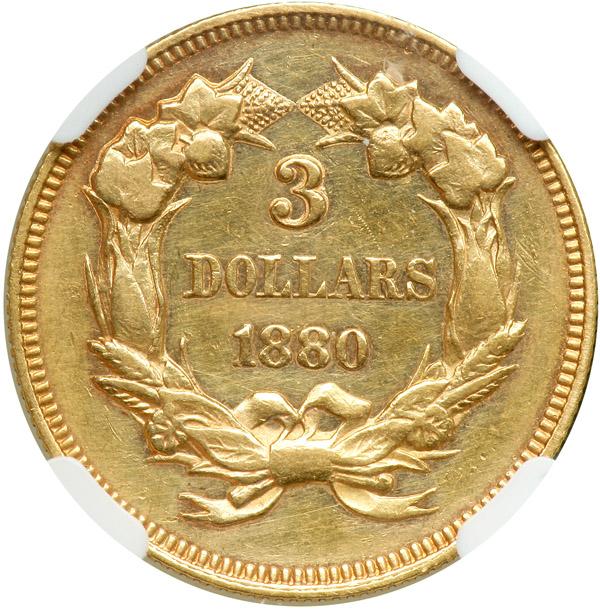 1880. NGC AU Details, improperly cleaned. Some reflective surfaces still evident about the protected areas. Light golden-orange toning rests about the borders. Only 1,000 struck -- which puts this in a class where many collectors are attracted (PCGS # 8002) .