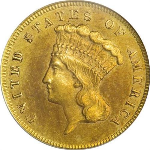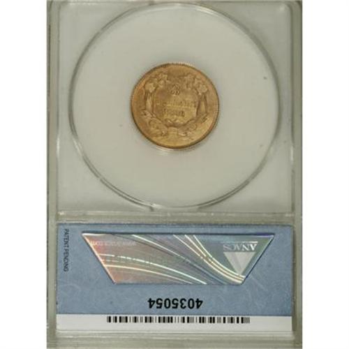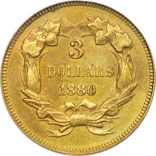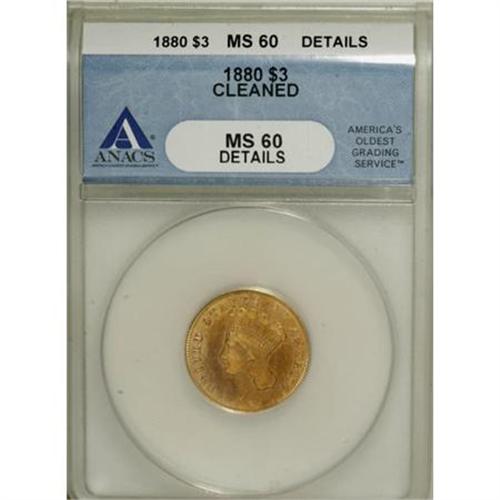 <B>1880 $3 --Cleaned--ANACS. MS60 Details.</B></I> This popular, low mintage date is always popular with collectors not only because of the mintage but also because there are so few Mint State survivors. This piece shows no signs of actual wear, but the surfaces have been harshly cleaned and have retoned a deep reddish-russet color.<BR><BR><B>Coin Engraver:</B> James B. Longacre<BR><BR><b>Shipping:</b> Coins & Currency (<a target="_blank" href="http://www.heritageauctions.com/common/shipping.php">view shipping information</a>)
