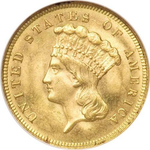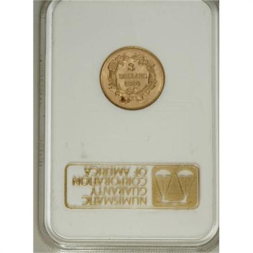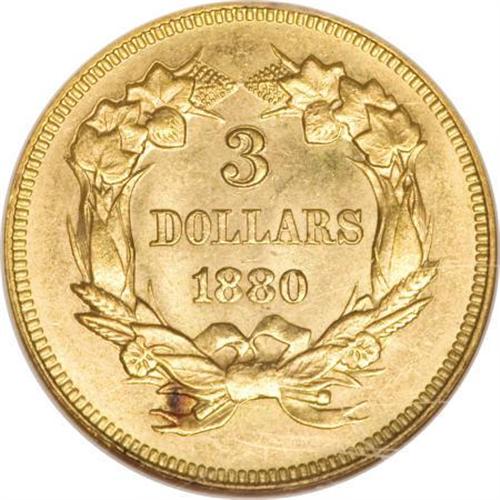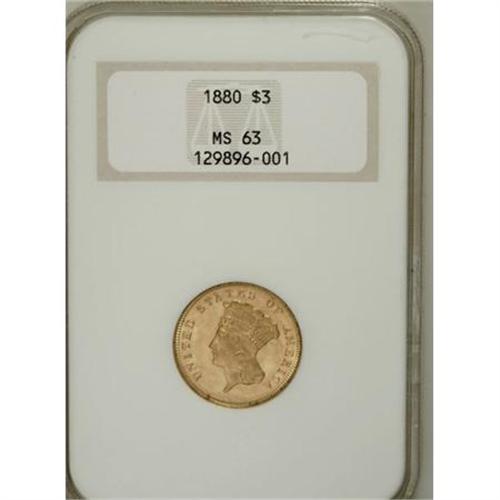 <B>1880 $3 MS63 NGC.</B></I> Although undesignated on the old-style NGC encapsulation, the surfaces demonstrate considerable prooflikeness on both sides, with rich orange-gold coloration prominent in the reflective fields, and well-frosted devices throughout. A better but far from impossible date within this challenging series, with a low mintage (1,000 coins) but a high survival rate. Census: 20 in 63, 65 finer (3/08).<BR><BR><B>Coin Engraver:</B> James B. Longacre<BR><BR><b>Shipping:</b> Coins & Currency (<a target="_blank" href="http://www.heritageauctions.com/common/shipping.php">view shipping information</a>)
