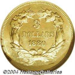<table><tr><td><table><tr><td>1880 $3 MS64 Prooflike NGC. The 1880 Three Dollar had an original mintage of only 1,000 pieces. And while numismatic authors such as Akers and Taglione have disparaged this date as not being as rare as its mintage indicates, in our experience we have handled very few pieces over the past several years. Like some other examples of this issue we have seen, the surfaces show a pleasing prooflike effect overall. Sharply struck with lovely honey-gold patina, there are a few small abrasions on the obverse but none of any significance. <BR><BR><B>Important notice:</B> Heritage usually auctions material at the rate of 200-250 lots per hour. On some occasions eBay Live bid software or the Internet may not be able to keep up with the pace of the auction. We recommend placing a realistic absentee bid now as insurance to avoid disappointment. Occasionally the auctioneer may eliminate or reject an eBay Live bid, and the auctioneer may also reopen a lot after the close of the eBay live bidding (usually because we missed an audience bid), and may reject your bid even if it shows you as the winning bidder. By bidding via eBay Live, you agree that Heritage may award the lot to another bidder at its sole discretion under the circumstances described above or any other reasonable circumstances. Since eBay bids are not shown to us until we open the lot on the floor, we treat those bids just like floor bids. In most cases the floor responds before the eBay bid is presented to us, due to Internet lag time, so for consistency we have made it a policy that floor bids are always considered first over tie eBay live bids. Also please note that all Heritage lots purchased through eBay Live carry a 20% Buyer's Premium. Please make sure you read the Terms and Conditions before you bid. <BR><BR><B>IMPORTANT ANNOUNCEMENT ABOUT RESERVES:</B> Heritage now divulges all reserves on its web site 7 days before every auction. If you want to know whether the reserve on this lot has been met, and if not, what the reserve amount is, please visit this lot page on the HeritageCoin.com web site, or email: bid@HeritageGalleries.com </span></font></td></tr></table></td></tr></table>