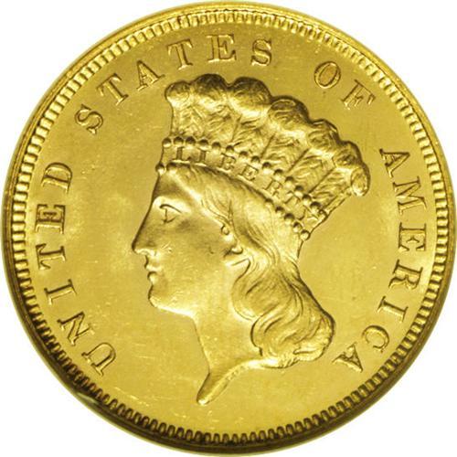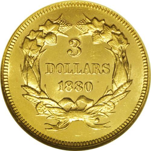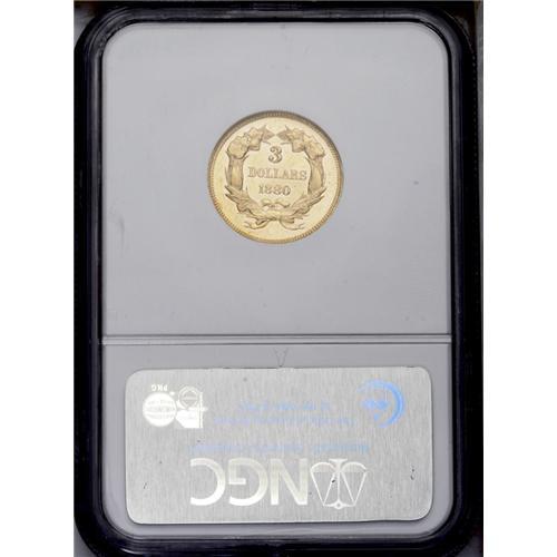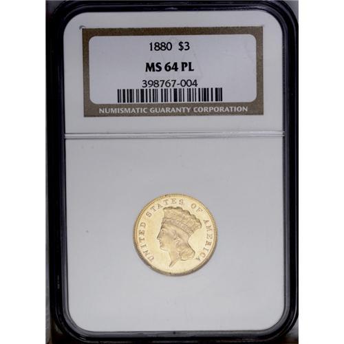 <B>1880 $3 MS64 Prooflike NGC.</B></I> With an original business strike mintage of just 1,000 coins, the 1880 is an understandably popular coin among today's gold collectors. Since the Three Dollar gold piece had stopped circulating widely by the late 1870s, this issue is not as rare as its original mintage might suggest. Nevertheless, the number of better Mint State survivors is quite limited. This brassy-gold example displays nice contrast between the well struck, lightly frosted design elements and the prooflike fields. Some scattered luster grazes preclude a higher grade. Census: 34 in 64, 15 finer (1/06).