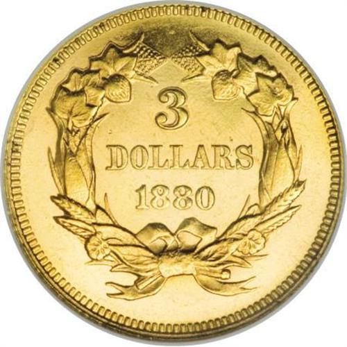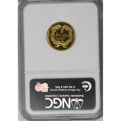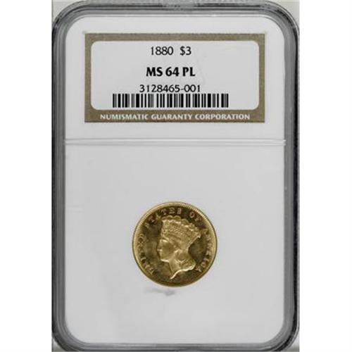 <B>1880 $3 MS64 Prooflike NGC.</B></I> The 1880 three dollar, coming from a paltry mintage of 1,000 business strikes, is rare in Mint State, and Prooflike coins such as this near-Gem, are few and far between. Indeed, NGC has to date (1/08) assigned the Prooflike designation to only 11 1880 three dollar pieces.<BR> The field-motif contrast jumps out at the observer, irrespective of the angle at which the coin is viewed. Additionally, a solid strike imparts excellent definition to the design elements, further enhancing the coin's eye appeal. The yellow-gold surfaces reveal a few minor grazes and ticks that just barely prevent full Gem status. Census: 5 in 64 Prooflike, 0 finer (1/08).<BR><BR><B>Coin Engraver:</B> James B. Longacre<BR><BR><b>Shipping:</b> Coins & Currency (<a target="_blank" href="http://www.heritageauctions.com/common/shipping.php">view shipping information</a>)