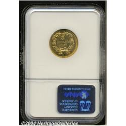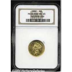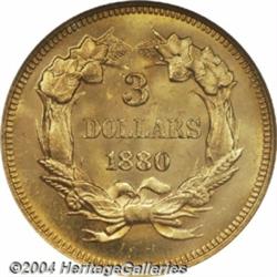 <B>1880<$3> MS65 NGC.</B></I> With an original business strike mintage of just 1,000 coins, the 1880 is an understandably popular coin among today's gold collectors. Since the Three Dollar gold piece had stopped circulating widely by the late 1870s, this issue is not as rare as its original mintage might suggest. Nevertheless, the number of Gem or better survivors totals at most only a few dozen pieces. Like virtually all known Mint State examples, this scintillating Gem is boldly detailed and exhibits prooflike tendencies beneath a delicate coating of reddish patina. The major design elements are richly frosted and spared from any appreciable signs of contact, while a few wispy field marks only come into view under light magnification. Population: 7 in 65, 4 finer (7/04). <BR><BR><B>Important notice:</B> Heritage usually auctions material at the rate of 200-250 lots per hour. On some occasions eBay Live bid software or the Internet may not be able to keep up with the pace of the auction. We recommend placing a realistic absentee bid now as insurance to avoid disappointment. Occasionally the auctioneer may eliminate or reject an eBay Live bid, and the auctioneer may also reopen a lot after the close of the eBay live bidding (usually because we missed an audience bid), and may reject your bid even if it shows you as the winning bidder. By bidding via eBay Live, you agree that Heritage may award the lot to another bidder at its sole discretion under the circumstances described above or any other reasonable circumstances. Since eBay bids are not shown to us until we open the lot on the floor, we treat those bids just like floor bids. In most cases the floor responds before the eBay bid is presented to us, due to Internet lag time, so for consistency we have made it a policy that floor bids are always considered first over tie eBay live bids. Also please note that all Heritage lots purchased through eBay Live carry a 20% Buyer's Premium. Please make sure you read the Terms and Conditions before you bid. </span></font></tr></table></td></tr></table>