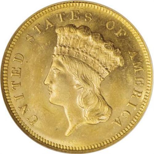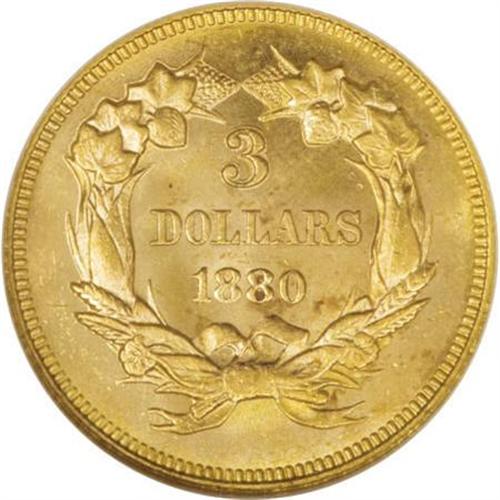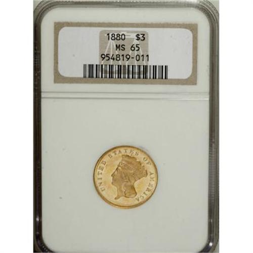 <B>1880 $3 MS65 NGC.</B></I> With a combination of intense mint frost and flashy semi-prooflikeness in the fields, this lovely Gem possesses a high degree of eye appeal. The lovely orange-gold, icy-gray, and sky-blue toning further enhances the overall beauty of the piece. The design elements are reproduced with great precision, showing mentionable weakness solely over the bowknot on the lower reverse. Only minuscule marks are found on either side of the coin. This issue had a low mintage of 1,000 business strikes, and survivors are scarce at the MS65 level of preservation. Census: 12 in 65, 4 finer (10/07). <BR><I>From The Nick-A-Jack Collection.</B></I><BR><BR><B>Coin Engraver:</B> James B. Longacre<BR><BR><b>Shipping:</b> Coins & Currency (<a target="_blank" href="http://www.heritageauctions.com/common/shipping.php">view shipping information</a>)