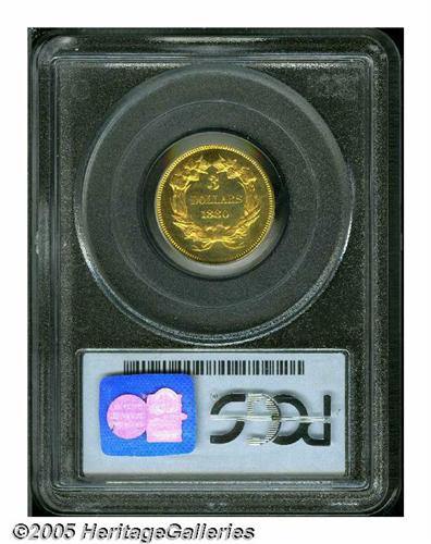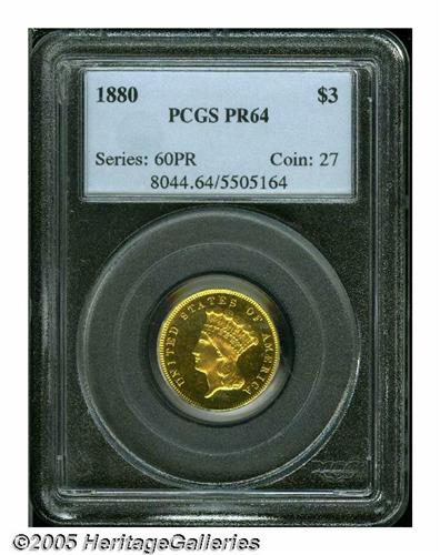 <B>1880<$3> PR64 PCGS.</B></I> Just 36 examples of this issue were originally coined in Proof format, and it is believed that about 20 survive today, in all grades. In the past dozen years, this is only the sixth time we have offered an example of this date in Proof format, one every two years. This is a sharply struck Choice Proof with rich honey-gold color. The surfaces have a few minor abrasions and hairlines, keeping this from the Gem class. Light cameo contrast is present, but not enough to be designated as a Cameo Proof. Population: 8 in 64, 3 finer (5/05).