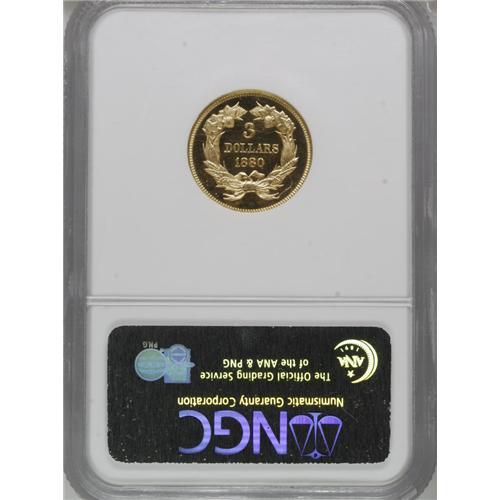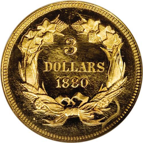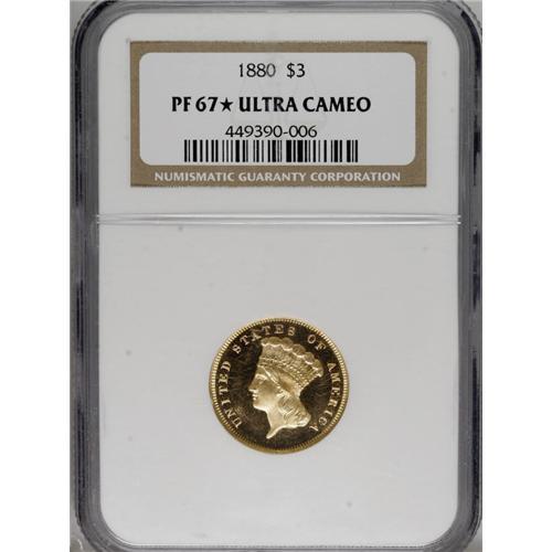 <B>1880 $3 PR67 <img border='0' src='http://www.heritagecoins.com/images/star.gif' width=10 height=10> Ultra Cameo NGC.</B></I> A remarkable beauty with pleasing light yellow color, this Superb proof has deeply mirrored fields and highly lustrous devices. The fields on both sides have the typical wavy or watery appearance of true Gem quality proof gold coins. A small orange toning spot below the bust tip and a tiny planchet flake outside the lower left part of the wreath may assist in tracking the provenance, but otherwise the surfaces are essentially perfect. Proof gold coins are among the rarest of all numismatic delicacies, deserving of accurate historical records, yet the general quality of these pieces is so high that such a provenance record is not easily constructed.<BR> Only 36 examples of the 1880 three dollar gold piece were coined in proof, with 20 pieces struck in February and the other 16 coins in September. In addition to these 36 pieces, a quantity of 1,000 business strikes were produced. Two different reverse dies were used, thus the proofs and business strikes can be differentiated, with the date slanting slight up to the right on proofs. A short linear defect on this piece is located on the top surface of the right ribbon end, and it is either a lint mark or a die line, although it is difficult to distinguish on this piece. If it is a lint mark, it would most likely be present only on this coin, but if it is a die line, then it is a further diagnostic to distinguish between proof and business strike examples of the date. Census: 2 in 67 <img border='0' src='http://www.heritagecoins.com/images/star.gif' width=10 height=10> Ultra Cameo, 0 finer (4/07).<BR><BR><b>Shipping:</b> Coins & Currency (<a target="_blank" href="http://www.heritageauctions.com/common/shipping.php">view shipping information</a>)