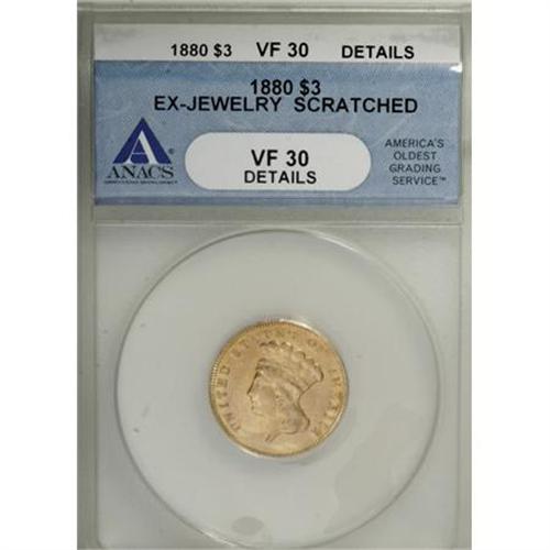 <B>1880 $3 --Ex-Jewelry, Scratched--ANACS VF30 Details.</B></I> NGC Census: (0/118). PCGS Population (0/177). Mintage: 1,036. Numismedia Wsl. Price for NGC/PCGS coin in VF30: $1,034. (#8002)<BR><BR><B>Coin Engraver:</B> James B. Longacre<BR><BR><b>Shipping:</b> Coins & Currency (<a target="_blank" href="http://www.heritageauctions.com/common/shipping.php">view shipping information</a>)