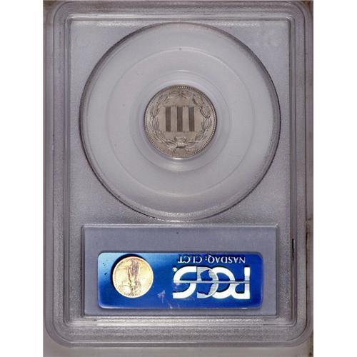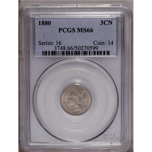 <B>1880 3CN MS66 PCGS.</B></I> Satiny and silky-smooth beneath layers of delicate gray patina. While perhaps not as scarce in better Mint State grades as its mintage of just 21,000 business strikes would suggest, the 1880 is nonetheless a difficult issue this nice. Population: 46 in 66, 30 finer (1/06).