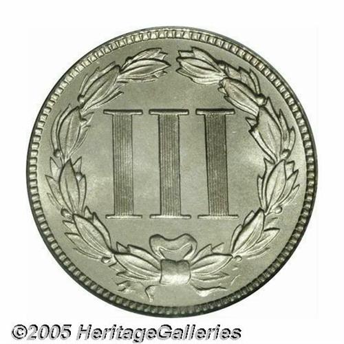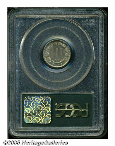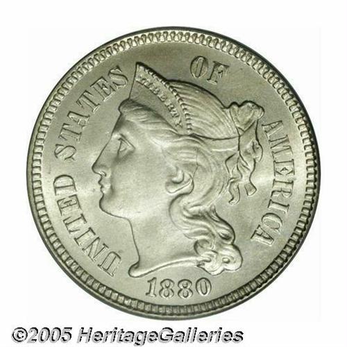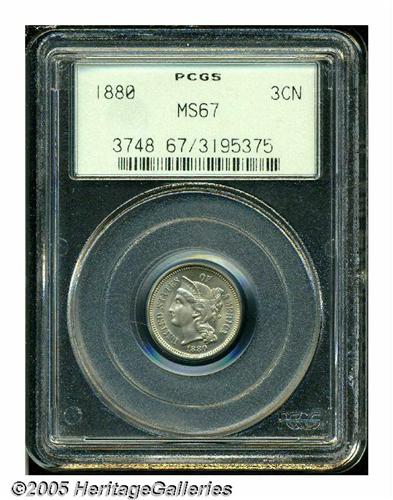 <B>1880<3CN> MS67 PCGS.</B></I> A scarce and desirable year for this business strike. The popularity of this odd coin was waning and Philadelphia ordered only about 20,000 pieces struck. This piece exhibits deep, satiny luster over pristine surfaces. Faint silver-gray patina lightly covers each side. The strike is razor-sharp on both sides with nearly full articulation in the Roman numerals. Oddly enough, a small hair rests across Liberty's hair curl, this obviously being property of a PCGS employee that was shed at the time of encapsulation. This features does nothing to diminish the appeal of this conditionally scarce Superb Gem, which remains highly attractive and very desirable as an addition to any high grade type collection. None have been certified at a higher grade level by either of the major services. Population: 29 in 67, 0 finer (4/05).<BR><I>From The Western Hills Collection.</B></I>