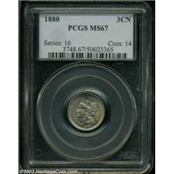 <table><tr><td><TABLE cellSpacing=0 cellPadding=0 width="100%" bgColor=#000000 border=0><TBODY> <TR><TD width="100%"><TABLE cellSpacing=1 cellPadding=3 width="100%" border=0><TBODY><TR><TD width="100%" bgColor=#79735c><FONT face=arial color=#ffffff size=3><B>Description</B> </FONT></TD></TR><TR><TD width="100%" bgColor=#ffffff><FONT face=arial size=2><B>1880 3CN MS67 PCGS.</B></I> Hints of reddish-magenta and gold patina adorn both sides of this vibrant, impeccably preserved example. Business strike production of the Three Cent Nickel had already begun to wane by the 1880s, although it enjoyed a brief one-year revival in 1881 before declining again. A few hundred high grade Uncirculated examples were apparently hoarded from the original mintage of 21,000 pieces, of which this coin is certainly among the finest to have survived. Population: 29 in 67, 0 finer (9/03). </FONT></TD></TR></TBODY></TABLE></TD></TR></TBODY></TABLE><BR><A name=PricesRealized></A><TABLE cellSpacing=0 cellPadding=0 width="100%" bgColor=#000000 border=0><TBODY><TR><TD width="100%"><TABLE cellSpacing=1 cellPadding=3 width="100%" border=0><TBODY><TR><TD width="100%" bgColor=#79735c><A name=PR><FONT face=arial color=#ffffff size=3><B>Previous Prices from Heritage Auctions</B> </FONT></A></TD></TR><TR><TD bgColor=#f6f6ed><TABLE cellSpacing=0 cellPadding=0 width="100%" border=1><TBODY><TR><TD align=middle width="33%"><B>Date</B></TD><TD align=middle width="33%"><B>Service</B></TD><TD align=middle width="33%"><B>Price</B></TD></TR><TR bgColor=whitesmoke><TD width="33%"><B>09/20/2003</B></TD><TD width="33%">PCGS</TD><TD width="33%">$2,990.00</TD></TR><TR bgColor=whitesmoke><TD width="33%"><B>05/03/2003</B></TD><TD width="33%">PCGS</TD><TD width="33%">$2,817.50</TD></TR><TR bgColor=whitesmoke><TD width="33%"><B>05/01/1998</B></TD><TD width="33%">PCGS</TD><TD width="33%">$2,860.00</TD></TR><TR bgColor=whitesmoke><TD width="33%"><B>04/01/1999</B></TD><TD width="33%">PCGS</TD><TD width="33%">$3,685.00</TD></TR></TBODY></TABLE></TD></TR><TR><TD bgColor=#ffffff><FONT face=arial size=1 ?>PLEASE NOTE: All prices realized reflect the final hammer price PLUS the buyer's premium in auctions that charge a buyer's premium. Each item has a notation at the top of the listing indicating whether that lot included a buyer's premium. Example: A item that sells with a final hammer price of $100 and a 20% buyer's premium will display with a price realized of $120. All information listed is intended to be as accurate as possible, but errors are possible. Please use this guide carefully and inform us of any inaccuracies. </FONT></TD></TR></TBODY></TABLE></TD></TR></TBODY></TABLE><BR><TABLE cellSpacing=0 cellPadding=0 width="100%" bgColor=#000000 border=0><TBODY><TR><TD width="100%"><TABLE cellSpacing=1 cellPadding=3 width="100%" border=0><TBODY><TR><TD width="100%" bgColor=#79735c colSpan=6><FONT face=arial color=#ffffff size=3><B>Price Guide*</B> </FONT></TD></TR><TR bgColor=#f6f6ed><TD align=middle><B>Grade</B> </TD><TD align=middle><B>Coin World<BR>(Trends)</B> </TD><TD align=middle><B>Numismedia<BR>Retail</B> </TD><TD align=middle><B>Numismedia<BR>Wholesale</B> </TD><TD align=middle><B>Coin<BR>Universe</B> </TD><TD align=middle><B>Heritage<BR>Value Index</B> </TD></TR><TR bgColor=#ffffff><TD align=middle>66</TD><TD align=right>$1,500.00</TD><TD align=right>---</TD><TD align=right>$1,300.00</TD><TD align=right>$1,600.00</TD><TD align=right>$923.43</TD></TR><TR style="FONT-WEIGHT: bold" bgColor=#cccfdd><TD align=middle>67</TD><TD align=right>---</TD><TD align=right>---</TD><TD align=right>$3,225.00</TD><TD align=right>$3,700.00</TD><TD align=right>$2,790.00</TD></TR><TR bgColor=#ffffff><TD align=middle>68</TD><TD align=right>---</TD><TD align=right>---</TD><TD align=right>---</TD><TD align=right>---</TD><TD align=right>---</TD></TR><TR bgColor=#ffffff><TD colSpan=6><FONT size=1>*All information listed is intended to be as accurate as possible, but errors are possible. No item may be returned or refused based on this information which is provided as a service to our customers. You should contact each pricing source directly to determine the accuracy of this information. </FONT></TD></TR></TBODY></TABLE></TD></TR></TBODY></TABLE><BR><TABLE cellSpacing=0 cellPadding=0 width="100%" bgColor=#000000 border=0><TBODY><TR><TD width="100%"><TABLE cellSpacing=1 cellPadding=3 width="100%" border=0><TBODY><TR><TD width="100%" bgColor=#79735c><FONT face=arial color=#ffffff size=3><B>Population Guide</B> </FONT></TD></TR><TR bgColor=#ffffff><TD align=middle><!-- Begin Output of Population Grid--><TABLE cellSpacing=0 cellPadding=0 width="100%" border=0><TBODY><TR><TD vAlign=center><TABLE cellSpacing=0 width="100%" border=1 cellsadding="3"><TBODY><TR><TD vAlign=center><TABLE cellSpacing=0 cellPadding=3 width="100%" border=1><TBODY><TR><TD vAlign=center align=middle bgColor=#f0f1e8 colSpan=2 <CENTER><FONT face=Arial size=2><B>PCGS Pop </B></FONT><CENTER></CENTER></TD><TD vAlign=center align=middle bgColor=#f0f1e8 colSpan=2><CENTER><FONT face=Arial size=2><B>NGC Pop</B></CENTER></FONT></TD></TR><TR><TD vAlign=center><FONT face=Arial size=2>(67)</FONT> </TD><TD vAlign=center align=right><FONT face=Arial size=2>29</FONT> </TD><TD vAlign=center><FONT face=Arial size=2>(67)</FONT> </TD><TD vAlign=center align=right><FONT face=Arial size=2>1</FONT> </TD></TR><TR><TD vAlign=center><FONT face=Arial size=2>(>67)</FONT> </TD><TD vAlign=center align=right><FONT face=Arial size=2>0</FONT> </TD><TD vAlign=center><FONT face=Arial size=2>(>67)</FONT> </TD><TD vAlign=center align=right><FONT face=Arial size=2>0</FONT> </TD></TR></TBODY></TABLE></TD></TR></TBODY></TABLE></TD></TR></TBODY></TABLE><!-- End Output of Population Grid--></TD></TR></TBODY></TABLE></TD></TR></TBODY></TABLE><BR><TABLE cellSpacing=0 cellPadding=0 width="100%" bgColor=#000000 border=0><TBODY><TR> Important notice: Heritage usually auctions material at the rate of 200-250 lots per hour. On some occasions 