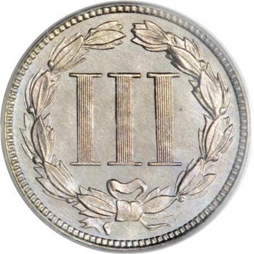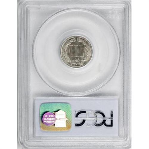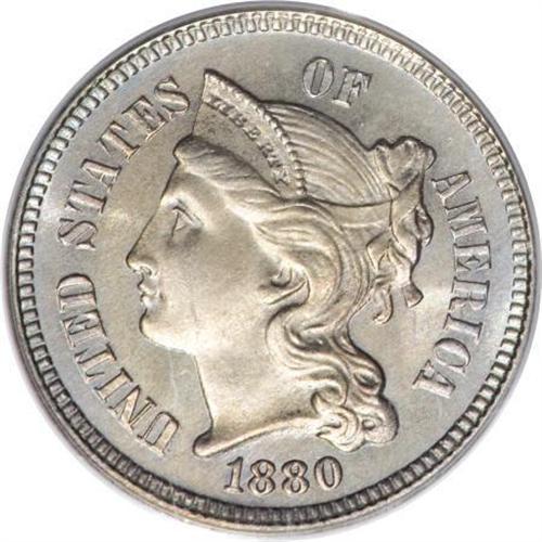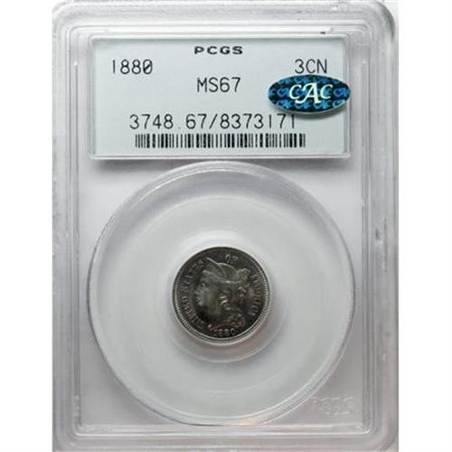 <B>1880 3CN MS67 PCGS. CAC.</B></I> Well struck and satiny with lovely ice-blue and almond-gold toning. Immaculate aside from a solitary pinpoint flyspeck. Unlike the 1881, the 1880 is a low mintage date more available as a proof than in Mint State. The second 8 in the date is lightly repunched north. In an old green label holder. Population: 32 in 67, 0 finer (11/07).<BR><I>From The Madison Collection.</B></I><BR><BR><B>Coin Engraver:</B> James B. Longacre<BR><BR><b>Shipping:</b> Coins & Currency (<a target="_blank" href="http://www.heritageauctions.com/common/shipping.php">view shipping information</a>)