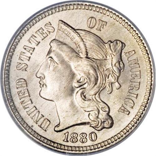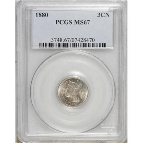<B>1880 3CN MS67 PCGS.</B></I> A remarkable and rare Superb Gem Mint State piece, normally found only in proof format. Business strikes are elusive and quite desirable. This sharply detailed piece is highly lustrous with pale gray surfaces and faint splashes of iridescence on each side. Population: 32 in 67, 0 finer (12/07).<BR><BR><B>Coin Engraver:</B> James B. Longacre<BR><BR><b>Shipping:</b> Coins & Currency (<a target="_blank" href="http://www.heritageauctions.com/common/shipping.php">view shipping information</a>)