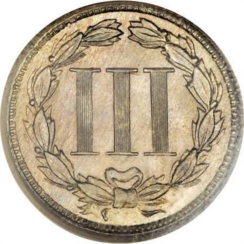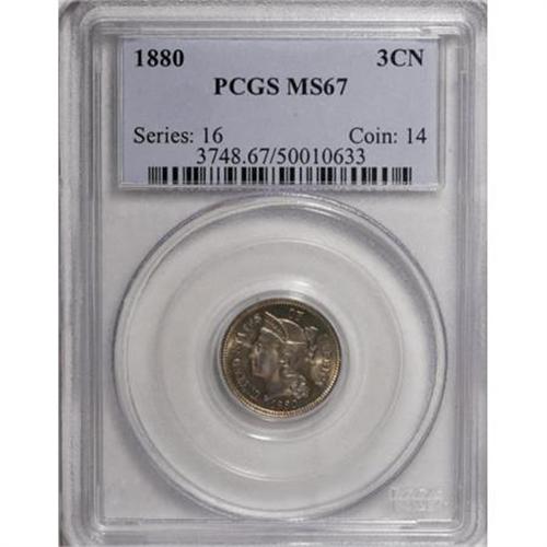 <B>1880 3CN MS67 PCGS.</B></I> Streaky gold and lilac patina adorns this vibrant and impeccably preserved example. The second 8 in the date is widely recut. Business strike production of the three cent nickel had already begun to wane by the 1880s, although it enjoyed a brief one-year revival in 1881 before declining again. The 1880 has a mintage of just 21,000 pieces, among which this coin is certainly among the finest to survive. Population: 32 in 67, 0 finer (2/08).<BR><BR><B>Coin Engraver:</B> James B. Longacre<BR><BR><b>Shipping:</b> Coins & Currency (<a target="_blank" href="http://www.heritageauctions.com/common/shipping.php">view shipping information</a>)