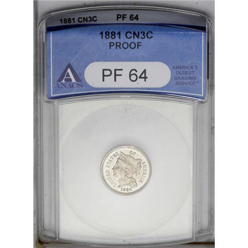 <B>1880<3CN> PR64 ANACS.</B></I> Due to a mechanical error, the holder incorrectly identifies this as an 1881. Unlike many from this era, this proof actually looks like a proof! The fields are deeply mirrored and the devices are sharply defined, except for isolated instances where die lapping has removed the design elements from the die. A pleasing light gold toned example with a few faint flecks on each side.