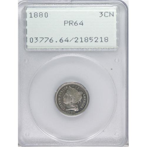 <B>1880 3CN PR64 PCGS.</B></I> This coin is close to a Cameo designation, with good contrast on the grayish-gold surfaces. It is likely only the somewhat more-subdued obverse luster that precluded a Gem grade. Certified in a small first-generation holder.<BR><BR><b>Shipping:</b> Coins & Currency (<a target="_blank" href="http://www.heritageauctions.com/common/shipping.php">view shipping information</a>)