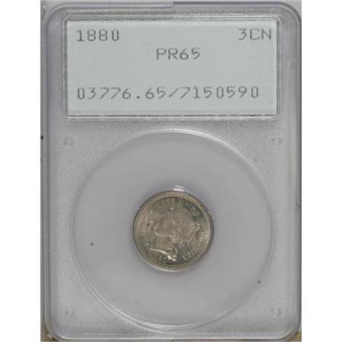 <B>1880 3CN PR65 PCGS.</B></I> PCGS Population (349/240). NGC Census: (333/243). Mintage: 3,955. Numismedia Wsl. Price for NGC/PCGS coin in PR65: $540. (#3776)<BR><BR><B>Coin Engraver:</B> James B. Longacre<BR><BR><b>Shipping:</b> Coins & Currency (<a target="_blank" href="http://www.heritageauctions.com/common/shipping.php">view shipping information</a>)