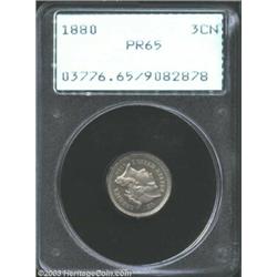 <TR><TD width="100%"><TABLE cellSpacing=1 cellPadding=3 width="100%" border=0><TBODY><TR><TD width="100%" bgColor=#79735c><FONT face=arial color=#ffffff size=3><B>Description</B> </FONT></TD></TR><TR><TD width="100%" bgColor=#ffffff><FONT face=arial size=2><B>1880 3CN PR65 PCGS.</B></I> The second 8 in the date has hints of recutting within the upper inside loop. A well struck Gem that has very mild cameo contrast, although this feature is not mentioned on the first-generation PCGS holder. Seemingly immaculate aside from a few tiny carbon flyspecks on the portrait. </FONT></TD></TR></TBODY></TABLE></TD></TR></TBODY></TABLE><BR><A name=PricesRealized></A><TABLE cellSpacing=0 cellPadding=0 width="100%" bgColor=#000000 border=0><TBODY><TR><TD width="100%"><TABLE cellSpacing=1 cellPadding=3 width="100%" border=0><TBODY><TR><TD width="100%" bgColor=#79735c><A name=PR><FONT face=arial color=#ffffff size=3><B>Previous Prices from Heritage Auctions</B> </FONT></A></TD></TR><TR><TD bgColor=#f6f6ed><TABLE cellSpacing=0 cellPadding=0 width="100%" border=1><TBODY><TR><TD align=middle width="33%"><B>Date</B></TD><TD align=middle width="33%"><B>Service</B></TD><TD align=middle width="33%"><B>Price</B></TD></TR><TR bgColor=whitesmoke><TD width="33%"><B>10/06/2000</B></TD><TD width="33%">PCGS</TD><TD width="33%">$437.00</TD></TR><TR bgColor=whitesmoke><TD width="33%"><B>01/09/1999</B></TD><TD width="33%">PCGS</TD><TD width="33%">$407.00</TD></TR><TR bgColor=whitesmoke><TD width="33%"><B>02/01/2000</B></TD><TD width="33%">PCGS</TD><TD width="33%">$862.00</TD></TR><TR bgColor=whitesmoke><TD width="33%"><B>01/01/1996</B></TD><TD width="33%">PCGS</TD><TD width="33%">$660.00</TD></TR><TR bgColor=whitesmoke><TD width="33%"><B>05/27/2003</B></TD><TD width="33%">PCGS</TD><TD width="33%">$414.00</TD></TR><TR bgColor=whitesmoke><TD width="33%"><B>05/31/2003</B></TD><TD width="33%">PCGS</TD><TD width="33%">$391.00</TD></TR><TR bgColor=whitesmoke><TD width="33%"><B>04/15/2003</B></TD><TD width="33%">PCGS</TD><TD width="33%">$414.00</TD></TR><TR bgColor=whitesmoke><TD width="33%"><B>08/14/2001</B></TD><TD width="33%">NGC</TD><TD width="33%">$390.00</TD></TR><TR bgColor=whitesmoke><TD width="33%"><B>03/27/2001</B></TD><TD width="33%">NGC</TD><TD width="33%">$381.00</TD></TR><TR bgColor=whitesmoke><TD width="33%"><B>01/05/2001</B></TD><TD width="33%">NGC</TD><TD width="33%">$460.00</TD></TR><TR bgColor=whitesmoke><TD width="33%"><B>04/11/1997</B></TD><TD width="33%">NGC</TD><TD width="33%">$308.00</TD></TR><TR bgColor=whitesmoke><TD width="33%"><B>11/28/2000</B></TD><TD width="33%">NGC</TD><TD width="33%">$400.00</TD></TR><TR bgColor=whitesmoke><TD width="33%"><B>09/10/1997</B></TD><TD width="33%">NGC</TD><TD width="33%">$308.00</TD></TR><TR bgColor=whitesmoke><TD width="33%"><B>03/23/2003</B></TD><TD width="33%">PCGS</TD><TD width="33%">$546.25</TD></TR><TR bgColor=whitesmoke><TD width="33%"><B>01/13/2003</B></TD><TD width="33%">PCGS</TD><TD width="33%">$437.00</TD></TR><TR bgColor=whitesmoke><TD width="33%"><B>01/11/2003</B></TD><TD width="33%">PCGS</TD><TD width="33%">$356.50</TD></TR><TR bgColor=whitesmoke><TD width="33%"><B>05/31/2001</B></TD><TD width="33%">PCGS</TD><TD width="33%">$506.00</TD></TR><TR bgColor=whitesmoke><TD width="33%"><B>03/13/2001</B></TD><TD width="33%">PCGS</TD><TD width="33%">$390.00</TD></TR><TR bgColor=whitesmoke><TD width="33%"><B>01/23/2001</B></TD><TD width="33%">PCGS</TD><TD width="33%">$380.00</TD></TR><TR bgColor=whitesmoke><TD width="33%"><B>08/29/2000</B></TD><TD width="33%">PCGS</TD><TD width="33%">$500.00</TD></TR><TR bgColor=whitesmoke><TD width="33%"><B>06/07/1997</B></TD><TD width="33%">PCGS</TD><TD width="33%">$385.00</TD></TR><TR bgColor=whitesmoke><TD width="33%"><B>01/06/1993</B></TD><TD width="33%">PCGS</TD><TD width="33%">$616.00</TD></TR><TR bgColor=whitesmoke><TD width="33%"><B>12/05/2000</B></TD><TD width="33%">PCGS</TD><TD width="33%">$390.00</TD></TR><TR bgColor=whitesmoke><TD width="33%"><B>01/07/2000</B></TD><TD width="33%">PCGS</TD><TD width="33%">$460.00</TD></TR><TR bgColor=whitesmoke><TD width="33%"><B>06/04/1995</B></TD><TD width="33%">PCGS</TD><TD width="33%">$412.50</TD></TR><TR bgColor=whitesmoke><TD width="33%"><B>09/13/1997</B></TD><TD width="33%">PCGS</TD><TD width="33%">$322.00</TD></TR><TR bgColor=whitesmoke><TD width="33%"><B>07/29/1997</B></TD><TD width="33%">PCGS</TD><TD width="33%">$577.50</TD></TR><TR bgColor=whitesmoke><TD width="33%"><B>07/30/1994</B></TD><TD width="33%">PCGS</TD><TD width="33%">$550.00</TD></TR><TR bgColor=whitesmoke><TD width="33%"><B>10/22/1993</B></TD><TD width="33%">PCGS</TD><TD width="33%">$506.00</TD></TR><TR bgColor=whitesmoke><TD width="33%"><B>01/12/2002</B></TD><TD width="33%">ANACS</TD><TD width="33%">$506.00</TD></TR><TR bgColor=whitesmoke><TD width="33%"><B>06/12/2001</B></TD><TD width="33%">ANACS</TD><TD width="33%">$330.00</TD></TR></TBODY></TABLE></TD></TR><TR><TD bgColor=#ffffff><FONT face=arial size=1 ?>PLEASE NOTE: All prices realized reflect the final hammer price PLUS the buyer's premium in auctions that charge a buyer's premium. Each item has a notation at the top of the listing indicating whether that lot included a buyer's premium. Example: A item that sells with a final hammer price of $100 and a 20% buyer's premium will display with a price realized of $120. All information listed is intended to be as accurate as possible, but errors are possible. Please use this guide carefully and inform us of any inaccuracies. </FONT></TD></TR></TBODY></TABLE></TD></TR></TBODY></TABLE><BR><TABLE cellSpacing=0 cellPadding=0 width="100%" bgColor=#000000 border=0><TBODY><TR><TD width="100%"><TABLE cellSpacing=1 cellPadding=3 width="100%" border=0><TBODY><TR><TD width="100%" bgColor=#79735c colSpan=6><FONT face=arial color=#ffffff size=3><B>Price Guide*</B> </FONT></TD></TR><TR bgColor=#f6f6ed><TD align=middle><B>Grade</B> </TD><TD align=middle><B>Coin World<BR>(Trends)</B> </TD><TD align=middle><B>Numismedia<BR>Reta