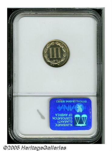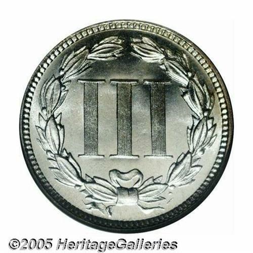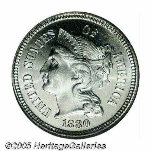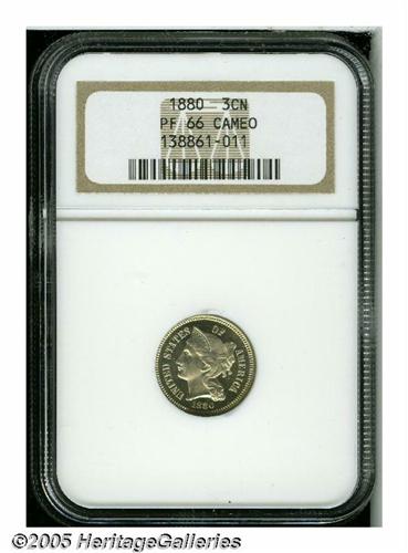 <B>1880<3CN> PR66 Cameo NGC.</B></I> Well mirrored surfaces are untoned and display more noticeable contrast on the obverse. One of the popular low total mintage issues from the 1880s. Population: 9 in 66 Cameo, 3 finer (4/05).<BR><I>From The Western Hills Collection.</B></I>