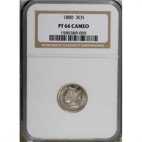 <B>1880 3CN PR66 NGC.</B></I> Philadelphia struck fewer than 25,000 three cent nickel pieces in 1880, and of them, 3,955 specimens were proofs. This Premium Gem offers carefully preserved, gleaming fields and satiny devices that provide noticeable contrast. Census: 15 in 66 Cameo, 3 finer (7/07).<BR><BR><b>Shipping:</b> Coins & Currency (<a target="_blank" href="http://www.heritageauctions.com/common/shipping.php">view shipping information</a>)