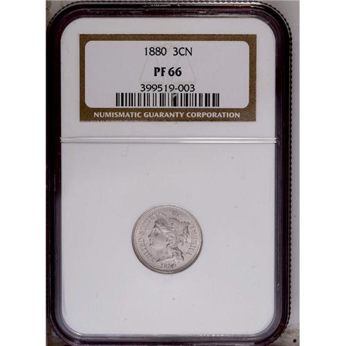 <B>1880<3CN> PR66 NGC.</B></I> A lightly tinted Premium Gem with modest reflective qualities. Remnants of an old spot are just visible between the 8 and the 0 in the date. <BR><BR><B>Important notice:</B> Heritage usually auctions material at the rate of 200-250 lots per hour. On some occasions eBay Live bid software or the Internet may not be able to keep up with the pace of the auction. We recommend placing a realistic absentee bid now as insurance to avoid disappointment. Occasionally the auctioneer may eliminate or reject an eBay Live bid, and the auctioneer may also reopen a lot after the close of the eBay live bidding (usually because we missed an audience bid), and may reject your bid even if it shows you as the winning bidder. By bidding via eBay Live, you agree that Heritage may award the lot to another bidder at its sole discretion under the circumstances described above or any other reasonable circumstances. Since eBay bids are not shown to us until we open the lot on the floor, we treat those bids just like floor bids. In most cases the floor responds before the eBay bid is presented to us, due to Internet lag time, so for consistency we have made it a policy that floor bids are always considered first over tie eBay live bids. Also please note that all Heritage lots purchased through eBay Live carry a 20% Buyer's Premium. Please make sure you read the Terms and Conditions before you bid. This lot is being auctioned in conjunction with a live floor auction by Heritage Galleries & Auctioneers. All final auction and invoice information will be supplied by Heritage Galleries & Auctioneers, and all other information should be considered preliminary. Lot:820 <BR><BR><B>Winning Notification and Billing:</B> After the FINAL session in this auction is complete, Heritage will send e-mail and snail mail invoices. This process normally takes several days. All final auction and invoice information will be supplied by Heritage Galleries & Auctioneers, and all other information should be considered preliminary. <BR><BR>This auction will be conducted on a live auction floor and over the Internet through eBay Live. If you choose to place an absentee bid, please take a moment to <font color='#0000ff'><u><a href='http://pages.ebay.com/liveauctions/help/before/laabsentee.html'>learn how eBay Live absentee bidding works</a></u></font><font color='#000000'>