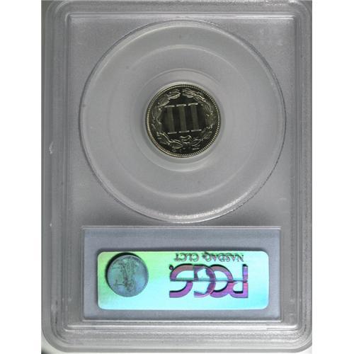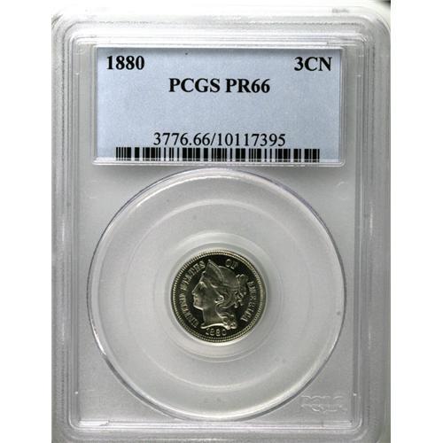 <B>1880<3CN> PR66 PCGS.</B></I> A mintage of 3955 proofs ensures that this date will be plentiful in high grades. As noted in Breen, "many proofs and several dozen Unc business strikes came from a hoard once owned by Virgil Brand, the Chicago beer tycoon." This is a moderately reflective proof with pleasing surfaces that are mostly brilliant with a light streak of golden across the center of the reverse.