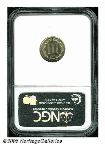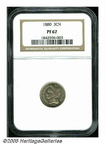 <B>1880<3CN> PR67 NGC.</B></I> Light orange and blue color tint the luster of this premium example that is, as should be expected, virtually flawless. Population: 35 in 67, 1 finer (6/05).