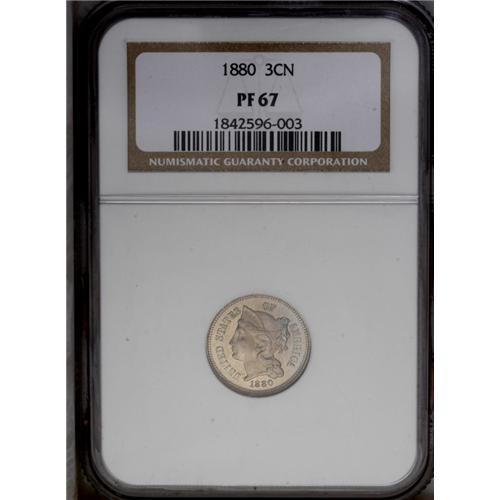 <B>1880<3CN> PR67 NGC.</B></I> Light orange and blue color tint the luster of this premium example that is, as should be expected, virtually flawless. All of the design features are well brought up. Census: 36 in 67, 1 finer (4/06).