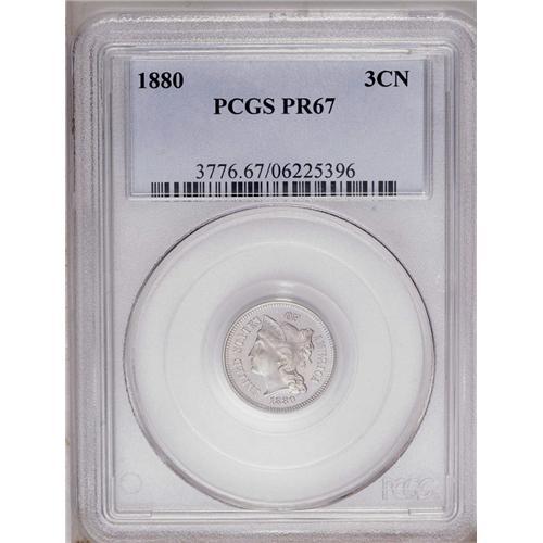 <B>1880<3CN> PR67 PCGS.</B></I> A dazzling, untoned specimen with excellent reflective qualities. The 1880 proof is known to come nice, but this Superb Gem is a notch finer than usual. Population: 33 in 67, 0 finer (5/06).