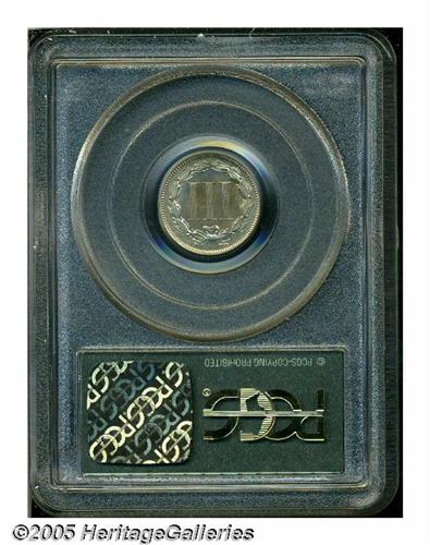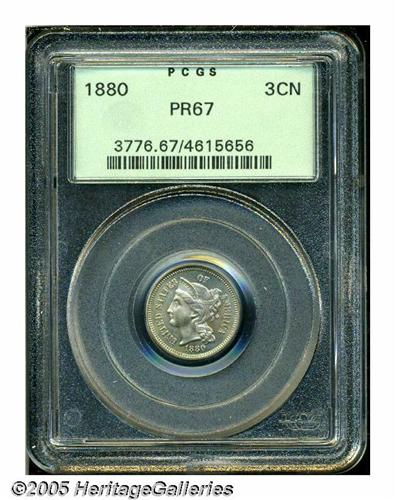 <B>1880<3CN> PR67 PCGS.</B></I> While showing only the slightest reflectivity in the fields, the surfaces overall are nearly perfect from a technical standpoint, and covered in lovely multicolored shadings that include pink iridescence near the centers, surrounded by pleasing green-gray pastel coloration. Population: 34 in 67, 0 finer (6/05).