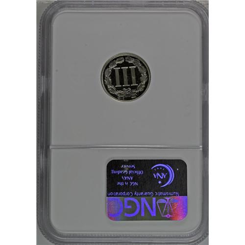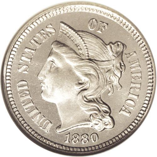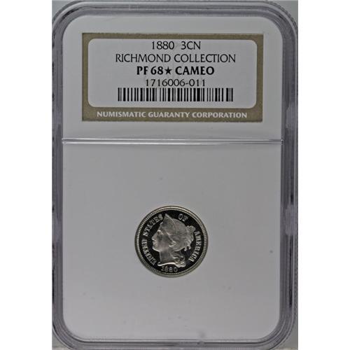 <B>1880<3CN> PR68 <img border='0' src='http://www.heritagecoins.com/images/star.gif' width=10 height=10> Cameo NGC.</B></I> Ex: Richmond Collection. Recutting is visible in the upper loop of the second 8, listed as the second proof die in the Breen proof reference. This stunning silver-on-black coin presents as brilliant, with heavily frosted devices and profoundly mirrored fields, yet under a loupe tiny flecks of golden-gray toning can be seen on each side. This piece is rightly deserving of its NGC Star designation, for the eye appeal is enormous. Highest graded of this issue with the Cameo designation.