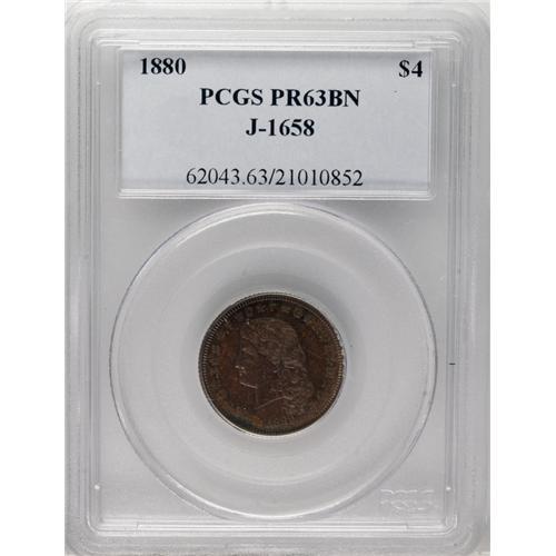 <B>1880 $4 Flowing Hair Four Dollar Stella, Judd-1658, Pollock-1858, Low R.7, PR63 Brown PCGS.</B></I> Barber's Flowing Hair design dated 1880. Struck in copper with a reeded edge. Deep chocolate-brown surfaces are accompanied by specks or hints of orange mint color and traces of iridescent toning. Like the other copper stella varieties, about a dozen examples of this issue are known, although an exact roster is not available (but absolutely needed). Time was that these pattern stellas were quite affordable in relation to the gold issues, but the present strong market and demand for rarities has driven the price of these pieces higher.<BR><I>From The Jones Beach Collection.</B></I><BR><BR><b>Shipping:</b> Coin/Currency (<a target="_blank" href="http://www.heritageauctions.com/common/shipping.php">view shipping information</a>)