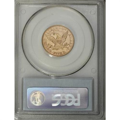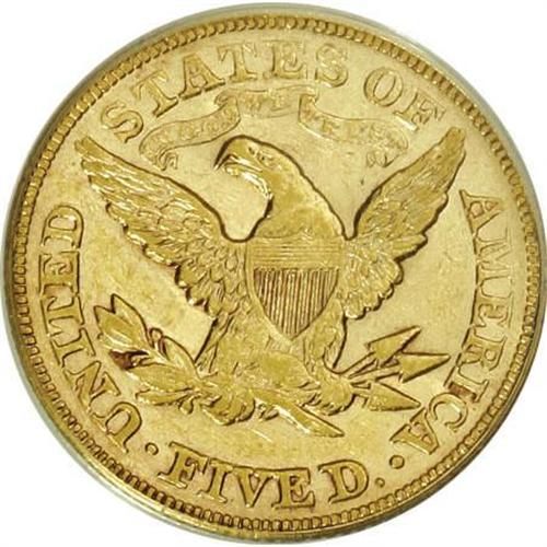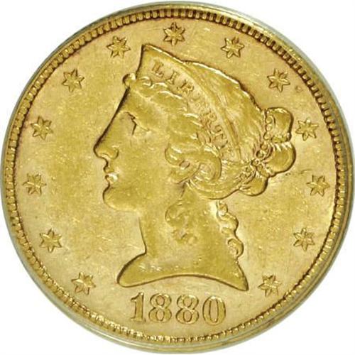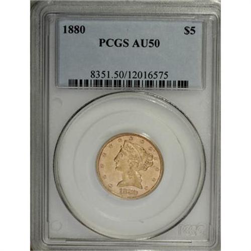 <B>1880 $5 AU50 PCGS.</B></I> PCGS Population (26/844). NGC Census: (13/1818). Mintage: 3,166,436. Numismedia Wsl. Price for NGC/PCGS coin in AU50: $240. (#8351)<BR><BR><B>Coin Engraver:</B> Christian Gobrecht<BR><BR><b>Shipping:</b> Coins & Currency (<a target="_blank" href="http://www.heritageauctions.com/common/shipping.php">view shipping information</a>)