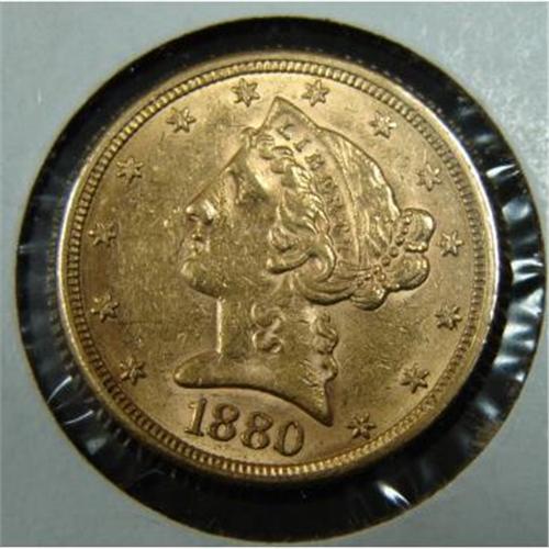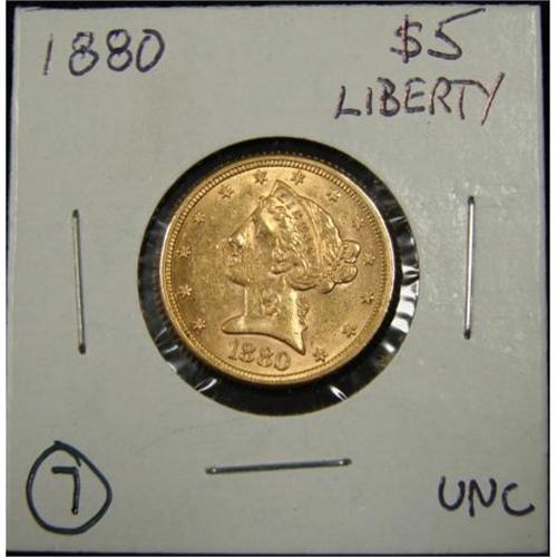 1880 $5 LIBERTY GOLD COIN. Unc.