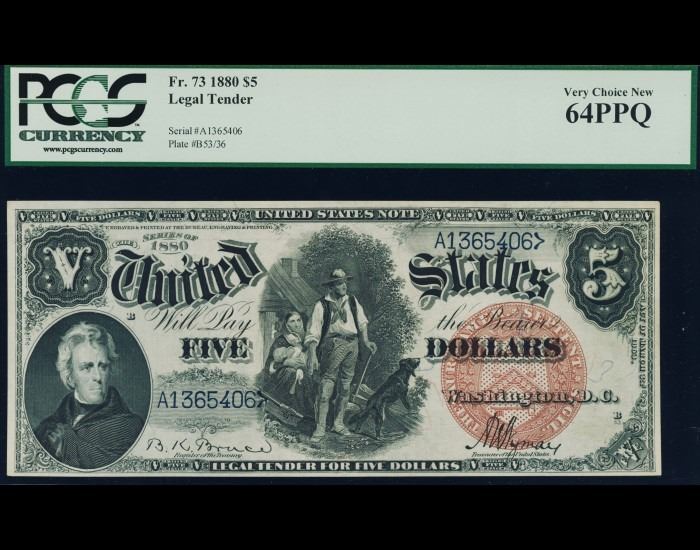 One 1880 $5 Legal Tender Note PCGS 64PPQ.