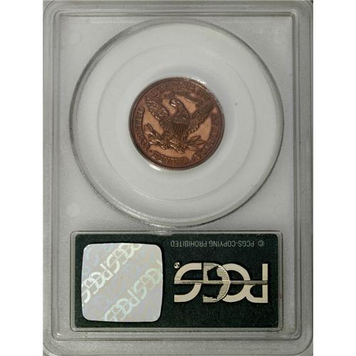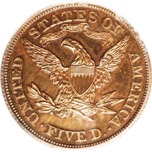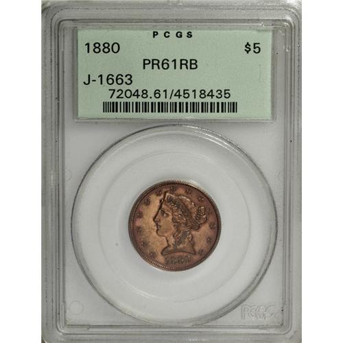 <B>1880 $5 Liberty Head Half Eagle, Judd-1663, Pollock-1863, R.8, PR61 Red and Brown PCGS.</B></I> The regular issue design for the With Motto Liberty half eagle. Struck in copper with a reeded edge. This example is sharply struck with mirrored fields and reflective devices. Both sides have pale orange color with faint hairlines, the result of cleaning at some time in the past. Hints of attractive iridescent toning are visible, especially on the obverse. Just three examples of this variety are known:<BR><BR>Proof. Harlan P. Smith; J.C. Mitchelson; Connecticut State Library.<BR>PR61 Red and Brown PCGS. The example offered here with pedigree below.<BR>PR66 Red and Brown PCGS. Quality Sales (11/1970), lot 1339; Harry W. Bass, Jr. (Bowers and Merena, 5/1999), lot 1378.<BR><I>Ex: King Farouk; State Rare Coin Auctions (1/1981); 2001 ANA Sale (Heritage, 8/2001), lot 8411.</B></I><BR><I>From The Jones Beach Collection.</B></I><BR><BR><b>Shipping:</b> Coin/Currency (<a target="_blank" href="http://www.heritageauctions.com/common/shipping.php">view shipping information</a>)