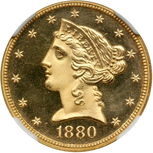 Unlike the often-seen business strike half eagles from 1880, Proofs are the extremely rarity. Only 36 Proofs were struck. It has been estimated that possibly ten examples are known today. David Akers, a noted authority on the series, described the Proof 1880 as, "…very rare, more so than any of the dates that follow. They have also appeared at auction less often than any date after 1859 except for the extremely rare and underrated 1861, 1870, 1871, and 1874." Today those words still ring true.
