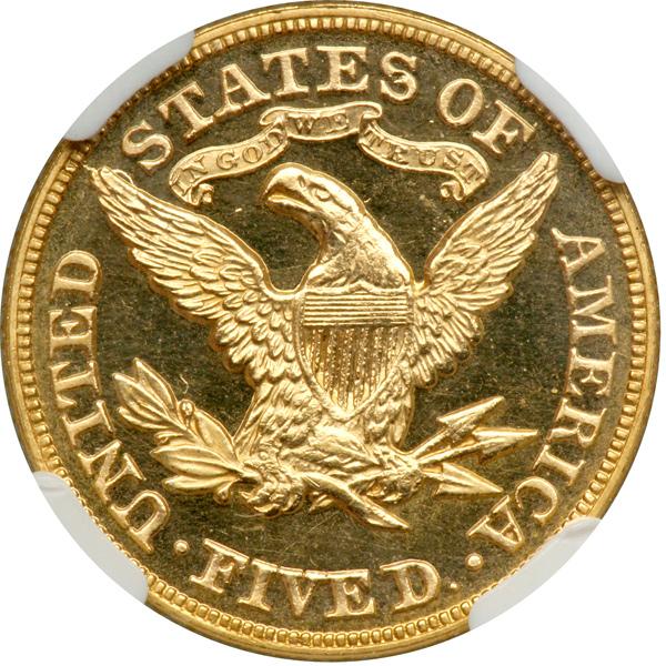 In keeping with the incredible Proof 67 grade, the fields are deeply mirrored, deep with reflection, and exhibit the well-known "orange peel" effect seen on Proofs from this era. The devices are deeply frosted. As such, they exhibit a noticeable cameo effect on each side. The coin has not been mistreated in any way in its 130-year existence. Its superb grade makes this a rare opportunity to acquire this seldom-offered Proof five. Pop 2; none finer at NGC (PCGS # 88475) .