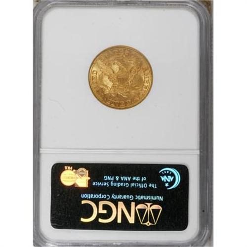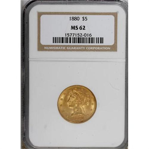 <B>1880 $5 MS62 NGC.</B></I> NGC Census: (419/255). PCGS Population (186/170). Mintage: 3,166,436. Numismedia Wsl. Price for NGC/PCGS coin in MS62: $340. (#8351)<BR><BR><B>Coin Engraver:</B> Christian Gobrecht<BR><BR><b>Shipping:</b> Coins & Currency (<a target="_blank" href="http://www.heritageauctions.com/common/shipping.php">view shipping information</a>)