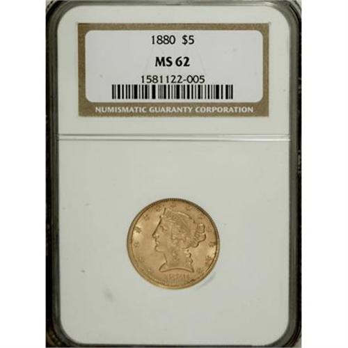 <B>1880 $5 MS62 NGC.</B></I> NGC Census: (419/255). PCGS Population (187/170). Mintage: 3,166,436. Numismedia Wsl. Price for NGC/PCGS coin in MS62: $340. (#8351)<BR><BR><B>Coin Engraver:</B> Christian Gobrecht<BR><BR><b>Shipping:</b> Coins & Currency (<a target="_blank" href="http://www.heritageauctions.com/common/shipping.php">view shipping information</a>)