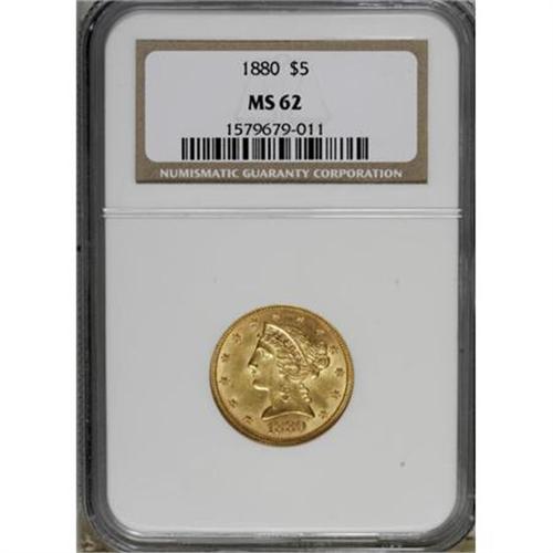 <B>1880 $5 MS62 NGC.</B></I> . NGC Census: (448/259). PCGS Population (189/175). Mintage: 3,166,436. Numismedia Wsl. Price for NGC/PCGS coin in MS62: $365. (#8351)<BR><BR><B>Coin Engraver:</B> Christian Gobrecht<BR><BR><b>Shipping:</b> Coins & Currency (<a target="_blank" href="http://www.heritageauctions.com/common/shipping.php">view shipping information</a>)