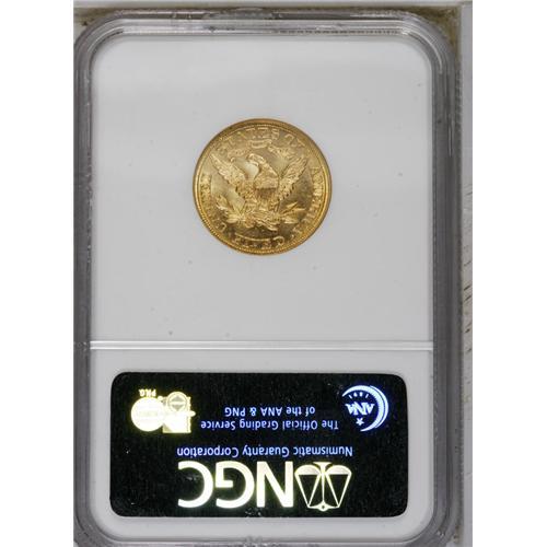 <B>1880<$5> MS64 NGC.</B></I> The highly lustrous and rather flashy yellow-gold surfaces turn to yellow-orange at the periphery. Solidly struck with marks in the fields that preclude Gem status.