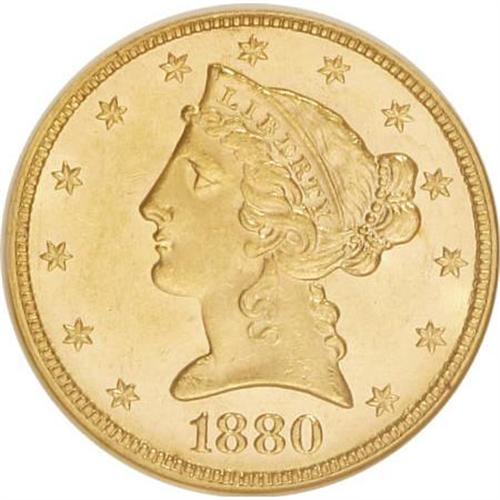 <B>1880 $5 MS64 NGC.</B></I> NGC Census: (91/24). PCGS Population (55/9). Mintage: 3,166,436. Numismedia Wsl. Price for NGC/PCGS coin in MS64: $1,850. (#8351)<BR><BR><B>Coin Engraver:</B> Christian Gobrecht<BR><BR><b>Shipping:</b> Coins & Currency (<a target="_blank" href="http://www.heritageauctions.com/common/shipping.php">view shipping information</a>\)