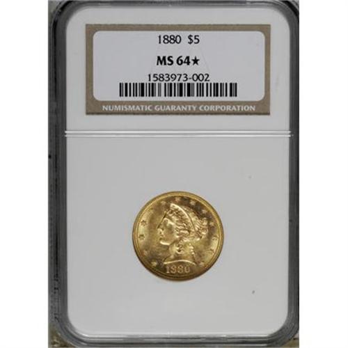 <B>1880 $5 MS64 </B></I><img src="/images/star.gif" width="10" height="10" alt="" border="0"><B> NGC.</B></I> A gorgeous Choice example of this ever-popular 19th century type issue, boldly struck with spectacular luster. The rich yellow-gold fields show a touch of flash, and while the fields show a few wispy marks, the portrait is clean overall. NGC has graded 24 numerically finer examples (1/08).<BR><BR><B>Coin Engraver:</B> Christian Gobrecht<BR><BR><b>Shipping:</b> Coins & Currency (<a target="_blank" href="http://www.heritageauctions.com/common/shipping.php">view shipping information</a>)