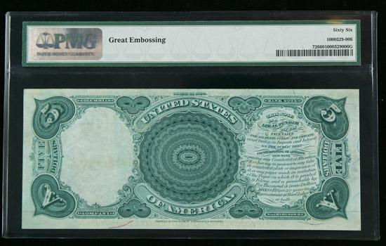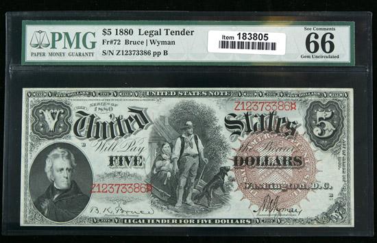 1880, $5 United States Note. PMG Gem Uncirculated 66. . Fr-72. This attractive Woodchopper boasts original embossing, good centering, and above average eye appeal. Neither PMG nor PCGS Currency have yet to grade a single example of this Fr. number in a higher grade than 66 EPQ or PPQ.