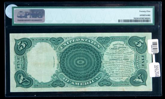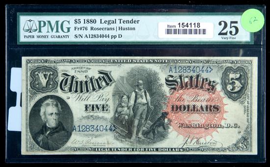 1880, $5 United States Note. PMG Very Fine 25. . Fr-76. . KL-206. This early Woodchopper has vivid colors and excellent eye appeal for the grade.