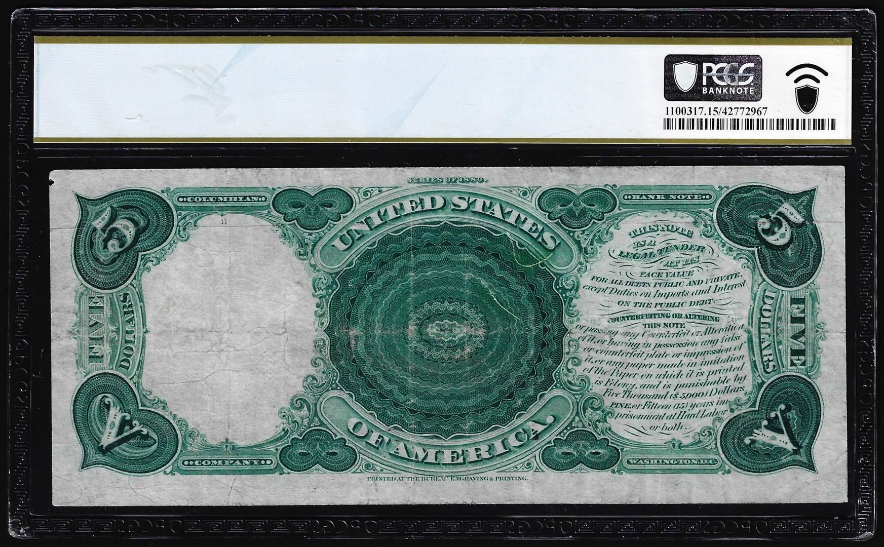 One 1880 $5 Woodchopper Legal Tender Note Fr.71 PCGS Choice Fine 15. PCGS Graded.