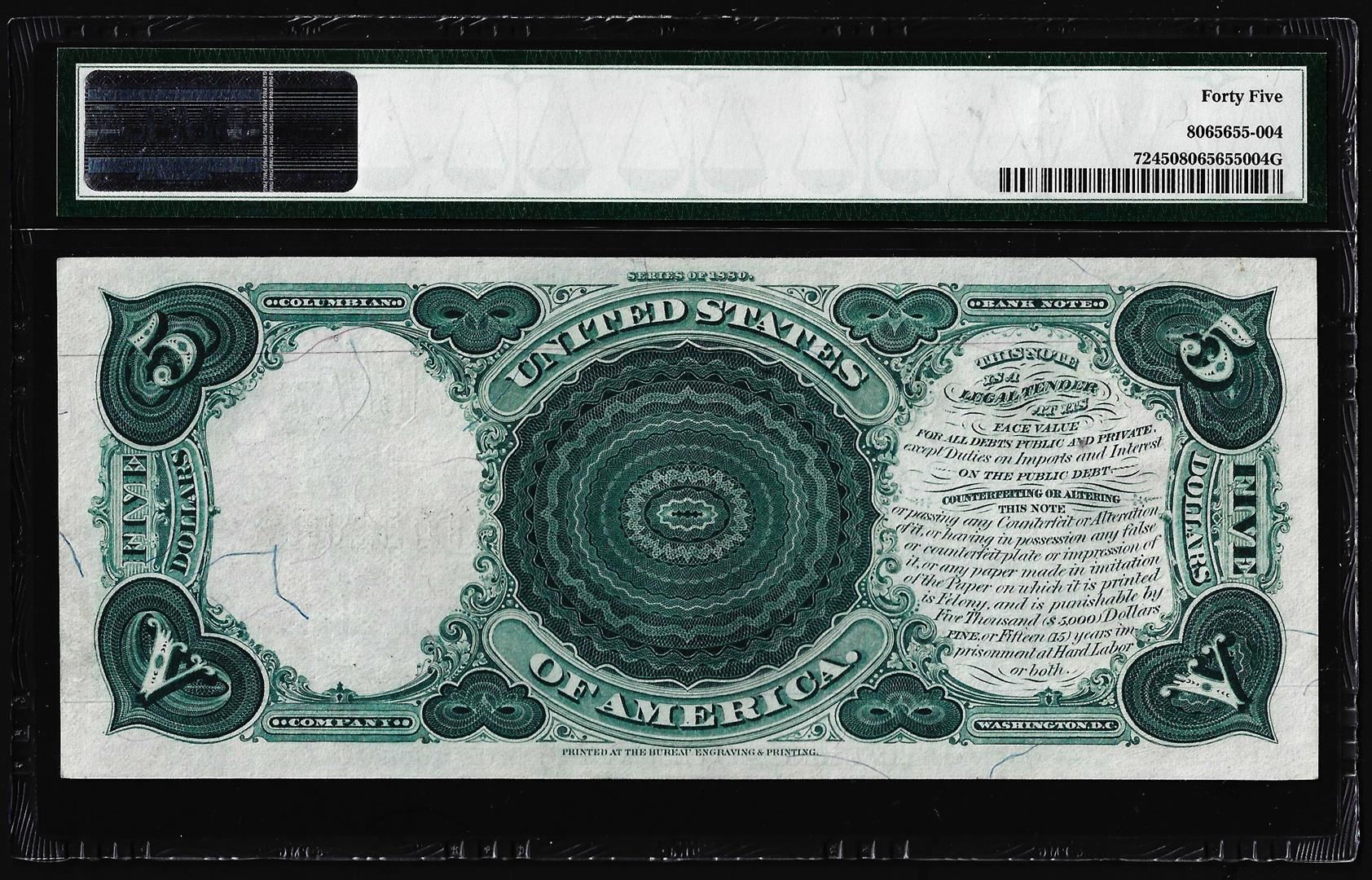 One 1880 $5 Woodchopper Legal Tender Note Fr.72 PMG Choice Extremely Fine 45. PMG Certified.