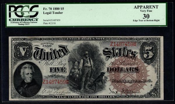 One 1880 $5 Woodchopper Legal Tender Note PCGS 30.